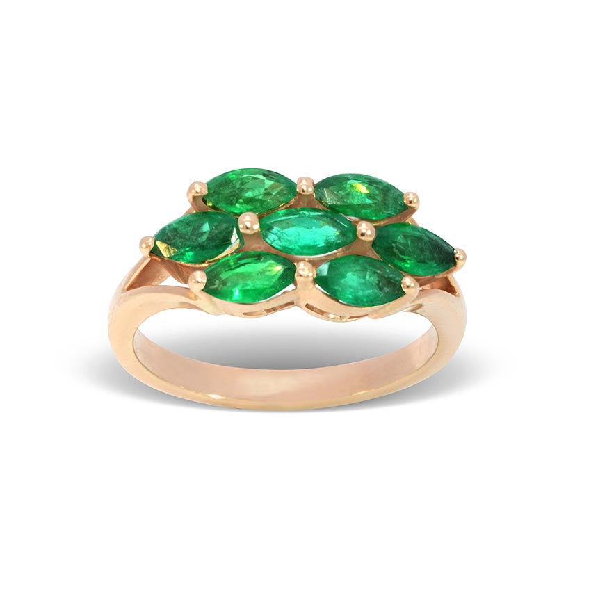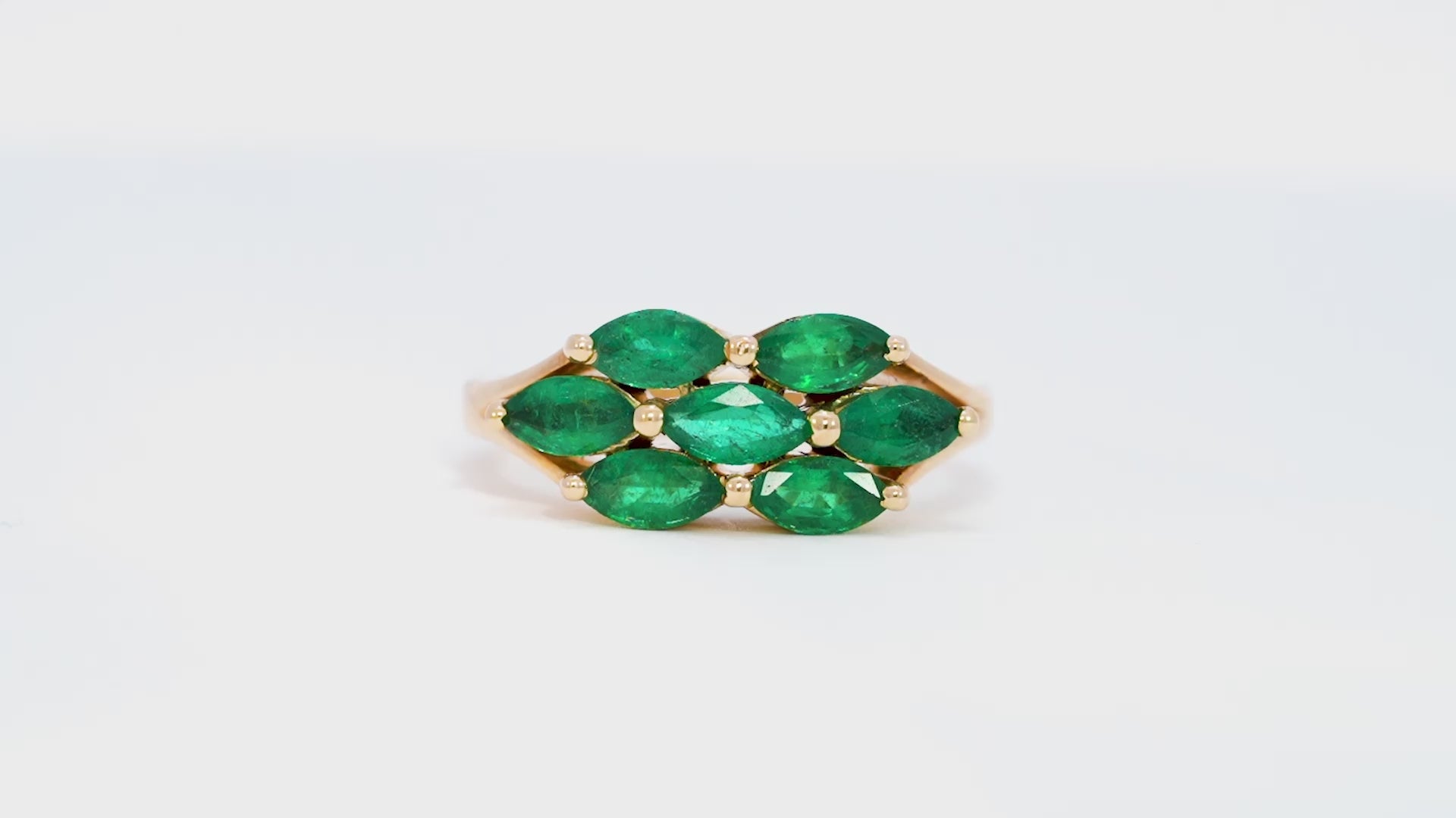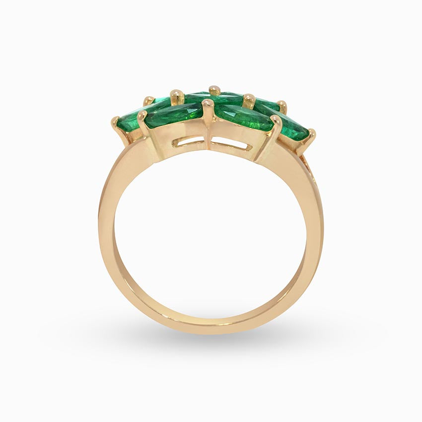 This 18K yellow gold ring, with its luminous emeralds, exudes classic beauty. The gold's radiant warmth enhances the emerald's natural vibrancy, making this ring a captivating choice for any jewelry lover.
